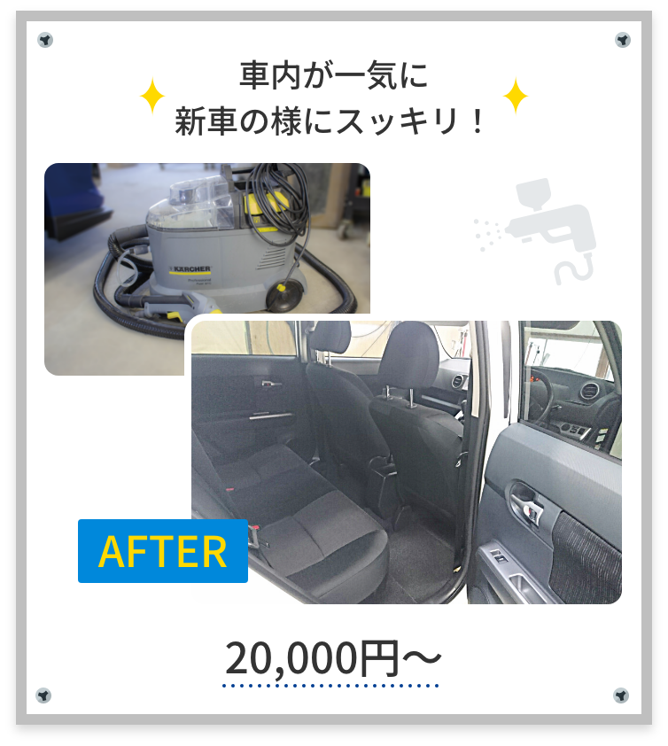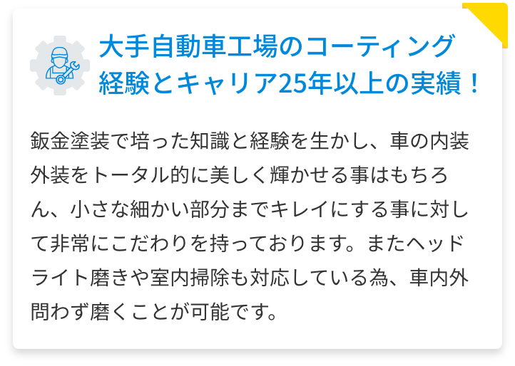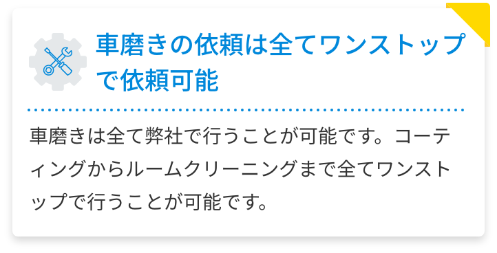 はい。当社はカーコーティング以外に、ルームクリーニング、フィルム、ガラス交換、オーデオ取付、デントリペア、新車、中古車、タイヤ販売、車検、鈑金、保険も取り扱っております。