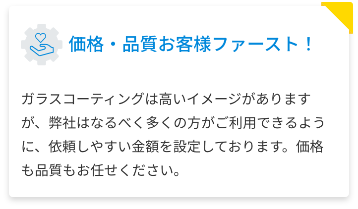 コーティング施工時には施工証明書を発行いたします。万が一事故が発生した場合、損害保険の対象となりますので、修理箇所の再施工も可能です。ご安心ください。